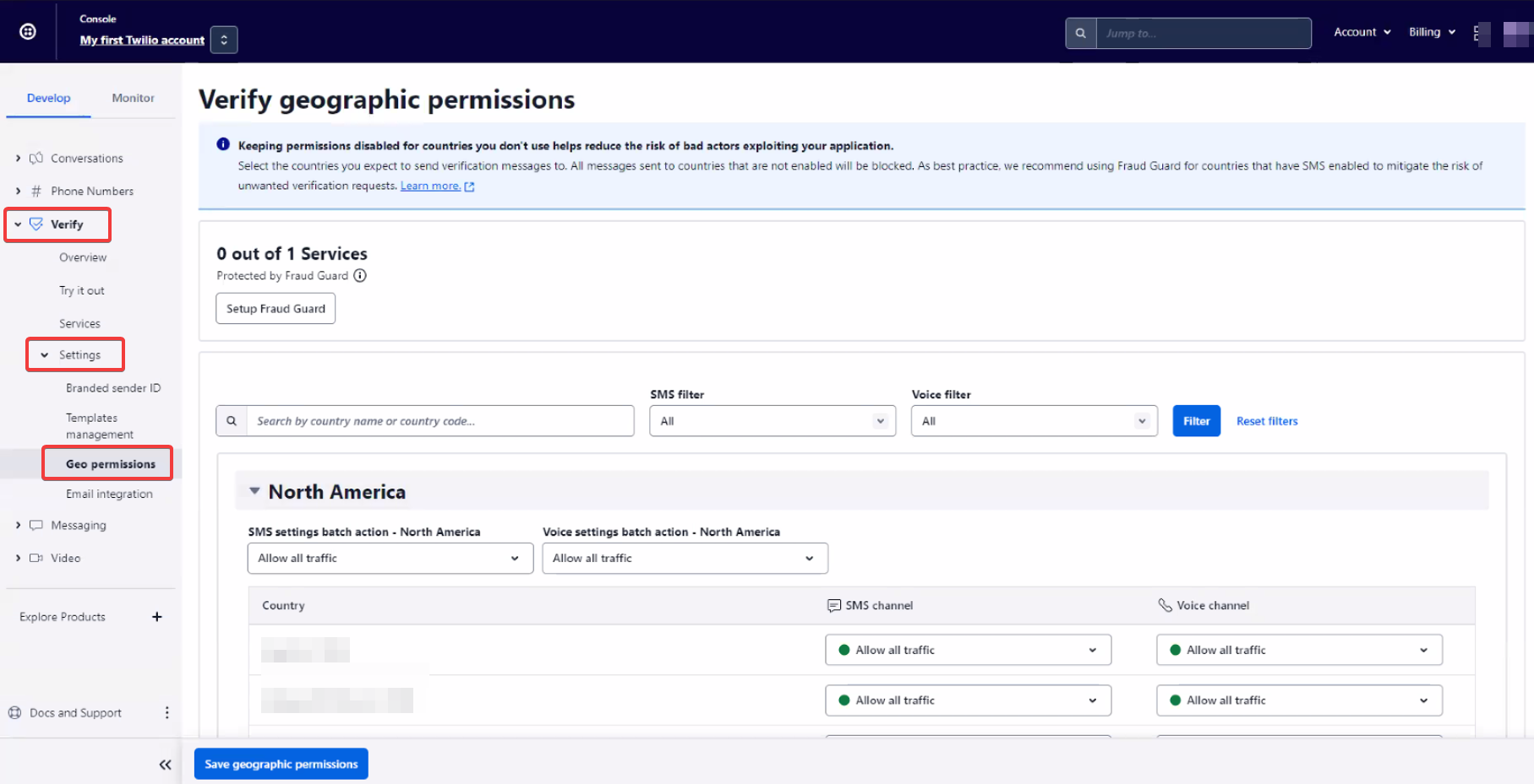 - Now, it's necessary to manage allowed recipient countries in Twilio settings on two pages.
