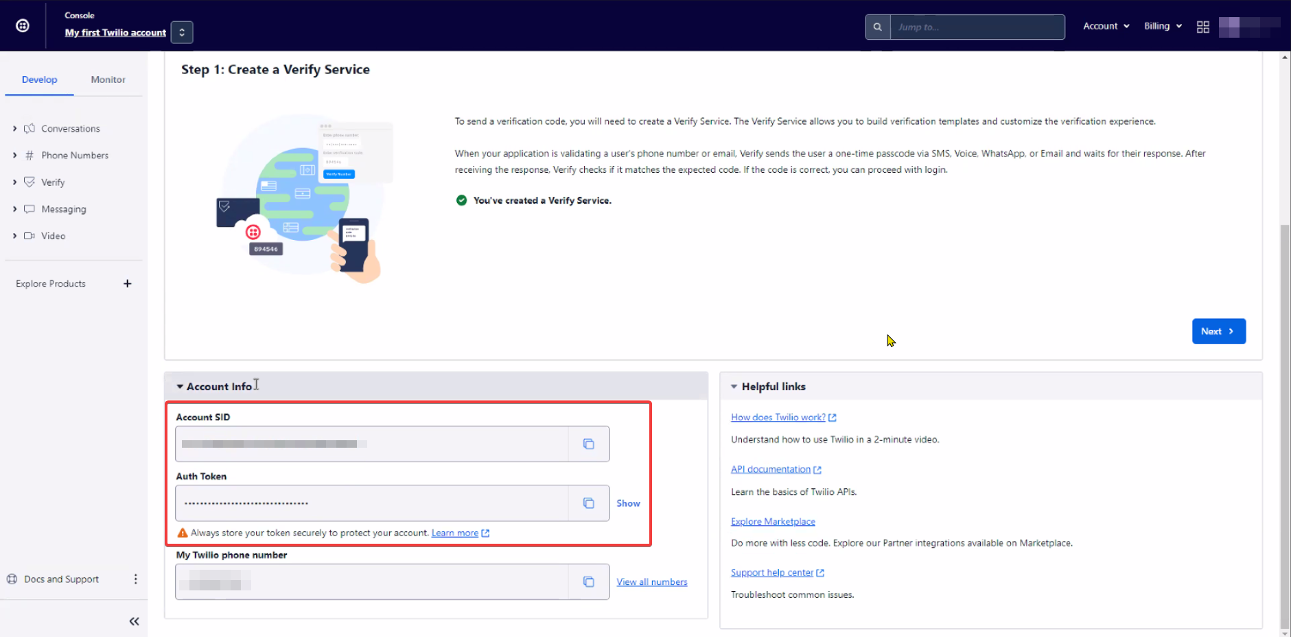 Two of the required keys are located on the main page of a backoffice of Twillio in the Account info article and are called Account SID and Auth token: