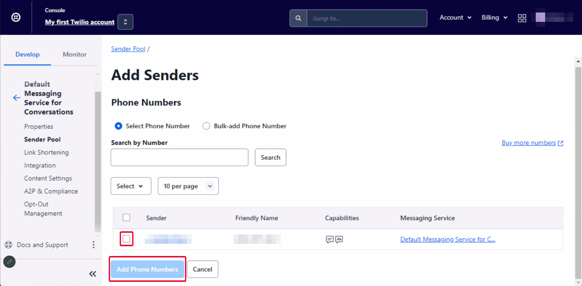 From here you want to select the preferred purchased phone number then press Add phone number.