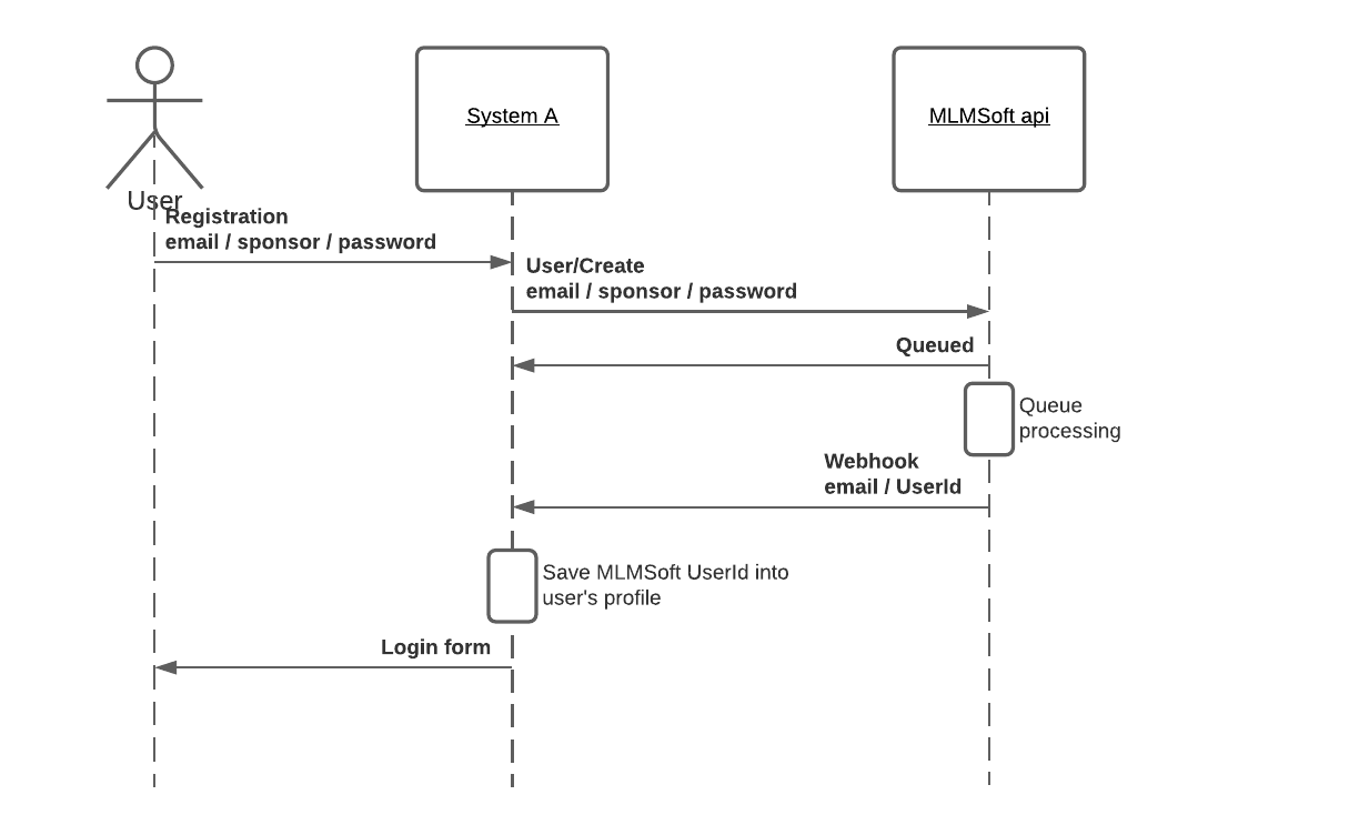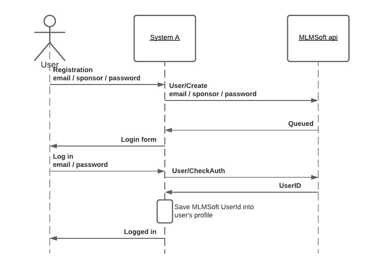 On a user's registration your system (referenced as System A) creates a user's record and sends user/create request to MLMSoft api. In response your system will get just a notification whether the request has been queued or not. Your system prompts the user for entering email and password and after checking it, sends them in user/check-auth request to MLMSoft api. Upon successful authorisation your system will get MLMSoft UserId that should be stored within the user record for future reference as a Sponsor ID or Volume destination.