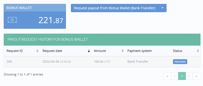 In the Withdrawal requests history table you can sort data by: Request ID, Request date/time, Amount, Status.