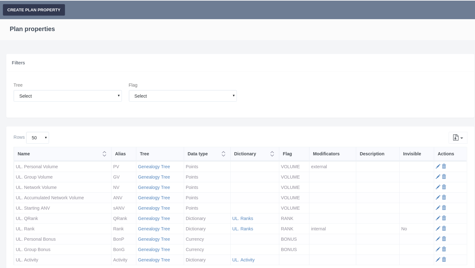 In the "Compensation plan engine" / "Plan properties" you can view, edit and create new marketing properties (for all plans at one moment).