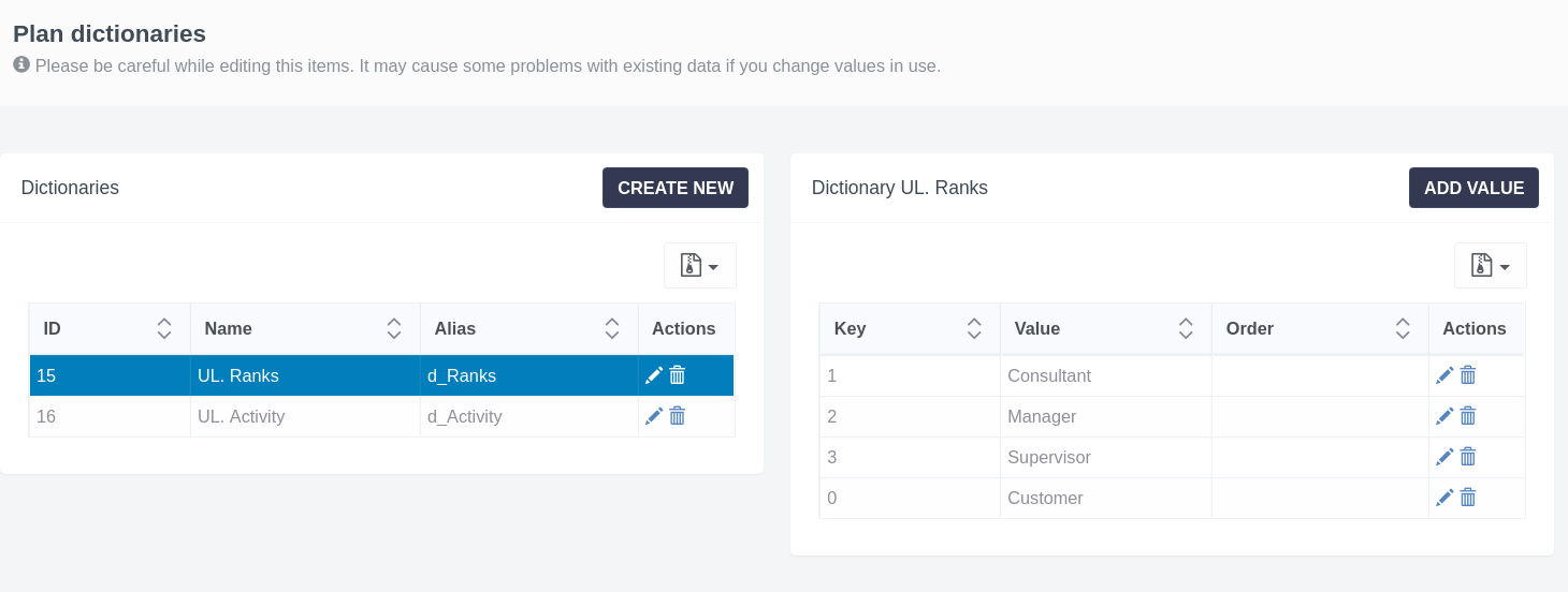 On the left of the page, a list of dictionaries of plans is displayed. Depending on the selected dictionary (the line is highlighted in blue), a list of keys and their values is displayed on the right side of the page. Values are used in the plan properties later, and keys to them, is the interpretation of the values for the system.