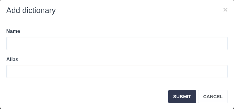 - On the form that opens, fill out the fields: Name and Alias of the created dictionary.