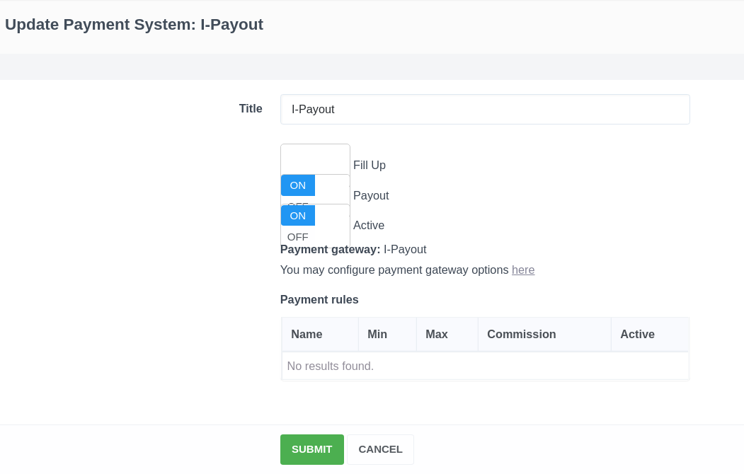 under there is note: You can configure payment gateway options here - Payment rules - a simplified table with a list of payment rules associated with this payment system.