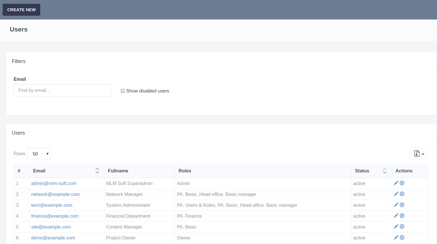On the "Users" page you can view and edit information about users: all their roles, email, full names and statuses.