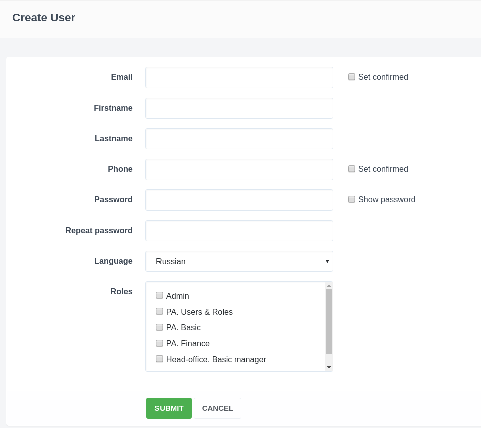 Email / Phone can be confirmed: if you are sure about it, then tick the "Set confirmed" box. In this case, user can immediately log into the system, without e-mail / phone confirmation. Otherwise, a letter will be sent to this e-mail / phone, in which there will be a link to the confirmation, which must be passed before entering the system.
