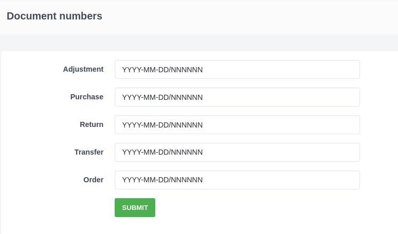 In this section you can configure custom document number formats. For each type of document, you may customize your template, where the placeholders are substituted.