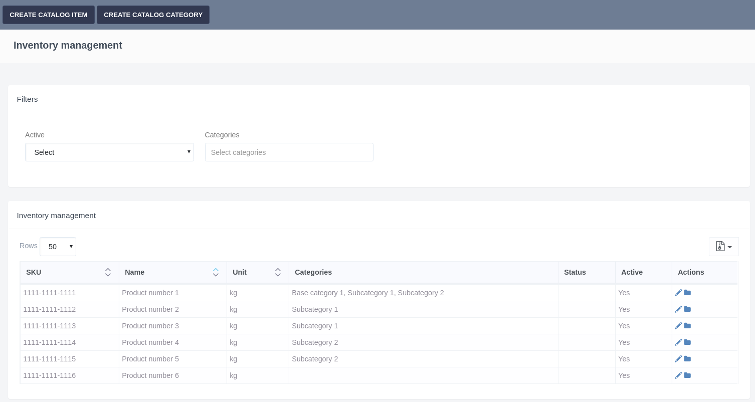 On the page you can filter the catalog products by Activity: Yes / No and by Category - the selection is available.