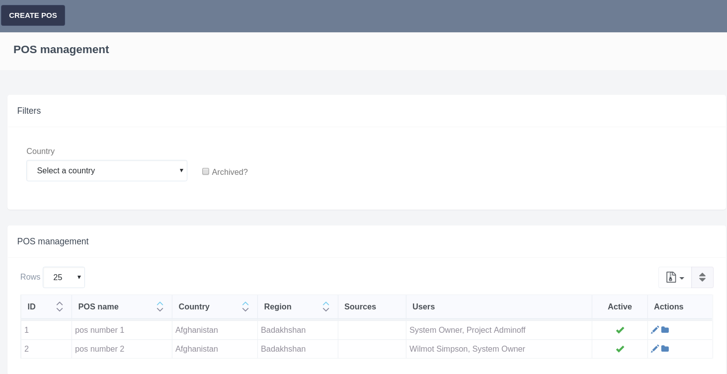 On this page there is a custom filter for the country and a checkbox "Archived?", which allows you to select archive stocks. With the help of icons in the Actions column, the stocks can be edited and archived. Also, the data in the grid can be sorted, exported in various formats, you can reset the sorting.