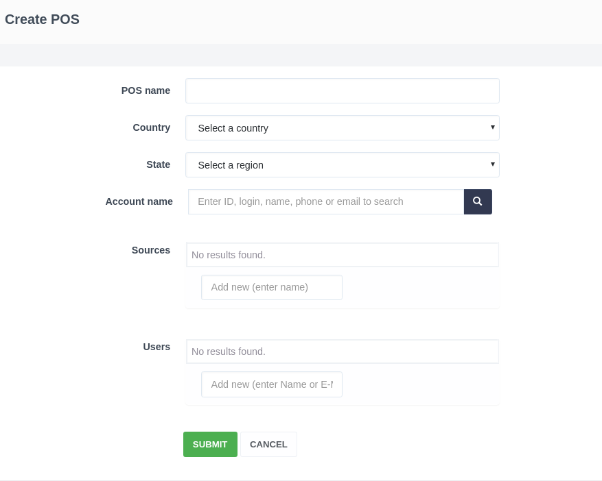 On the form of creating a stock you should specify its name, country and state (these are related fields), the name of the linked account, the list of sources, the list of users, then click Submit.