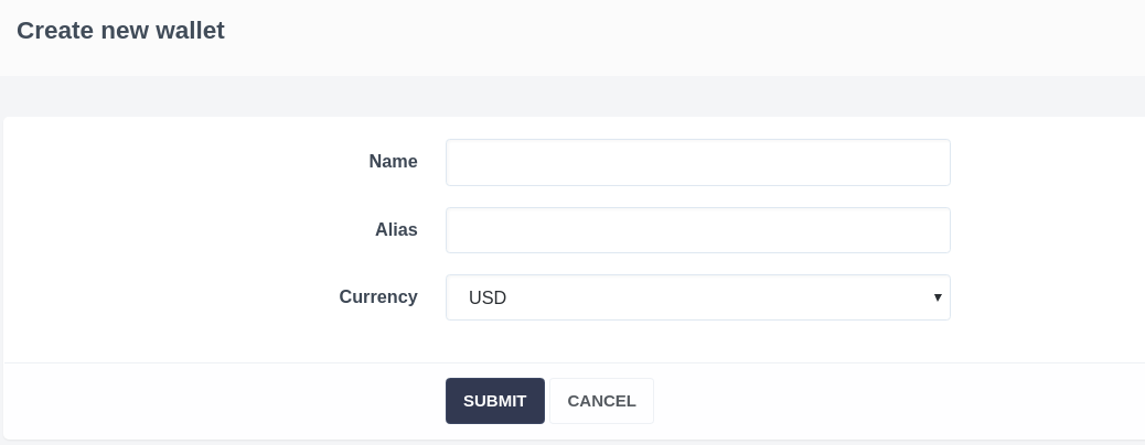 - Fill out the opened form, enter the name, alias (abbreviated name) and select the currency for the wallet.