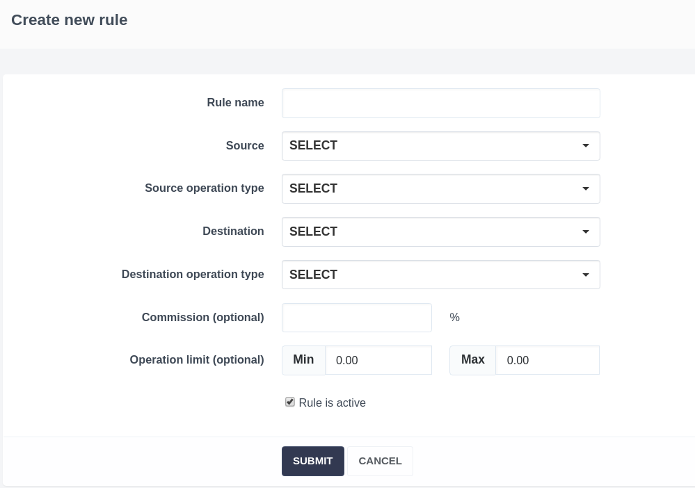 - Operation limit (optional) - specify the minimum (Min) and the maximum (Max) allowed value for transfers of this rule.