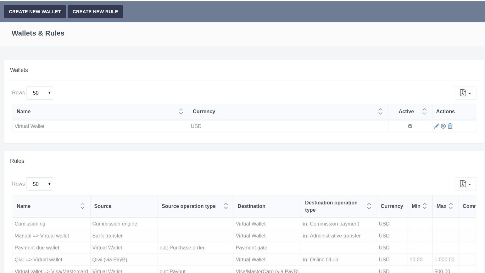 In the "Financial Settings" / "Wallets and Rules" section you can view, edit, delete or disable existing wallets and rules and create new ones.