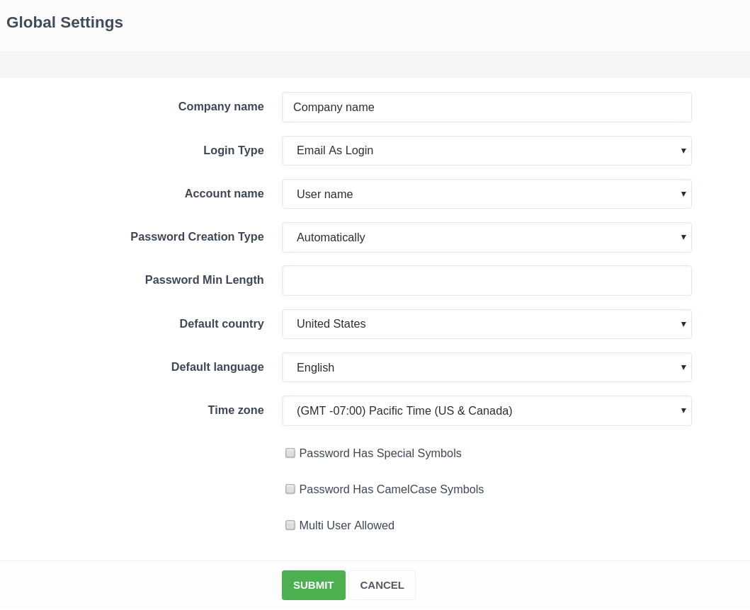 In the section "System settings" / "Global settings" you can view and change the global settings of application. Settings are displayed in the form with input fields or selection from the drop-down lists.