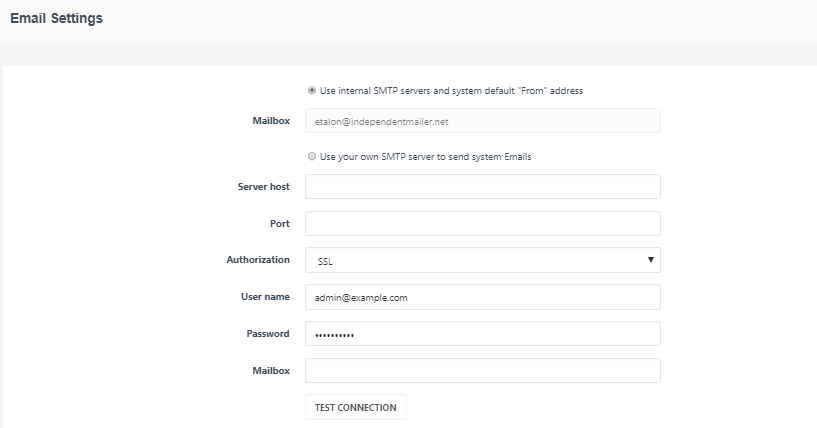 Use your own SMTP server to send system emails - check the box, if you want to use your server and fill out the following fields: Server host, Port, Authorization, User name, Password, then enter email. address of the user in the Mailbox field and click the "Test connection" button. When you click on the "Test Connection" button, a dialog box appears asking you to enter the e-mail address, to which send the test letter.