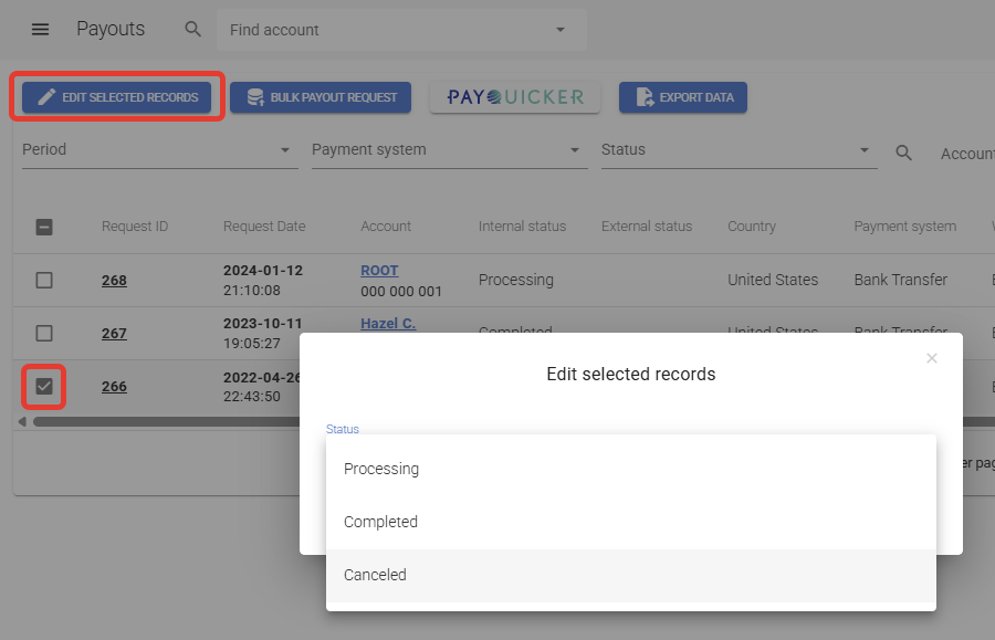 You can change status of a request (one by one or in bulk). Use Pending status when you send the requests to processing, for example you've sent them to you accountant to initiate ACH or wire transfers, or your uploaded them to your payout provider.