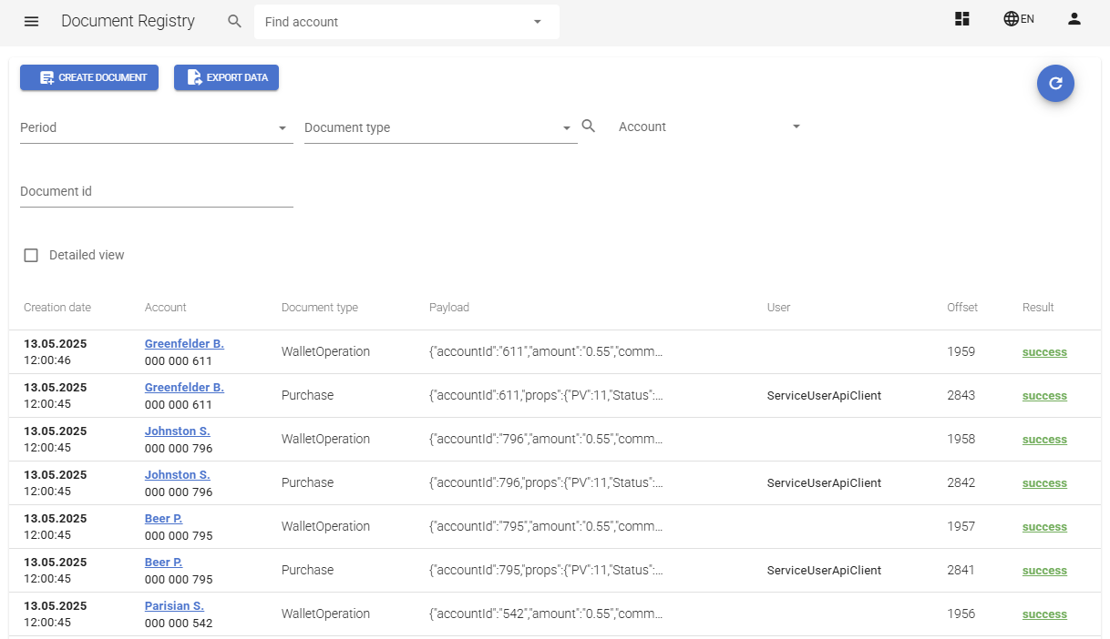The Document Registry section contains all documents created during system operations and interactions with external services. In this section, users can view, filter, and manage documents.