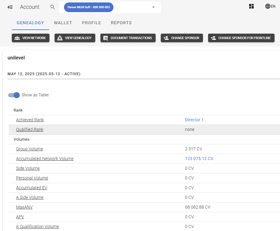 - View Genealogy – Opens visual tree page, again filtered by the account's downline.