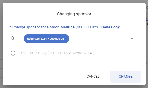 This button opens a menu that allows you to search for a member by ID, Email, first name, last name and set him as a new sponsor, enter search criteria, select an account in the search results - below busy positions under the selected account will be shown, you can set the selected account as a new sponsor by clicking the Change button.