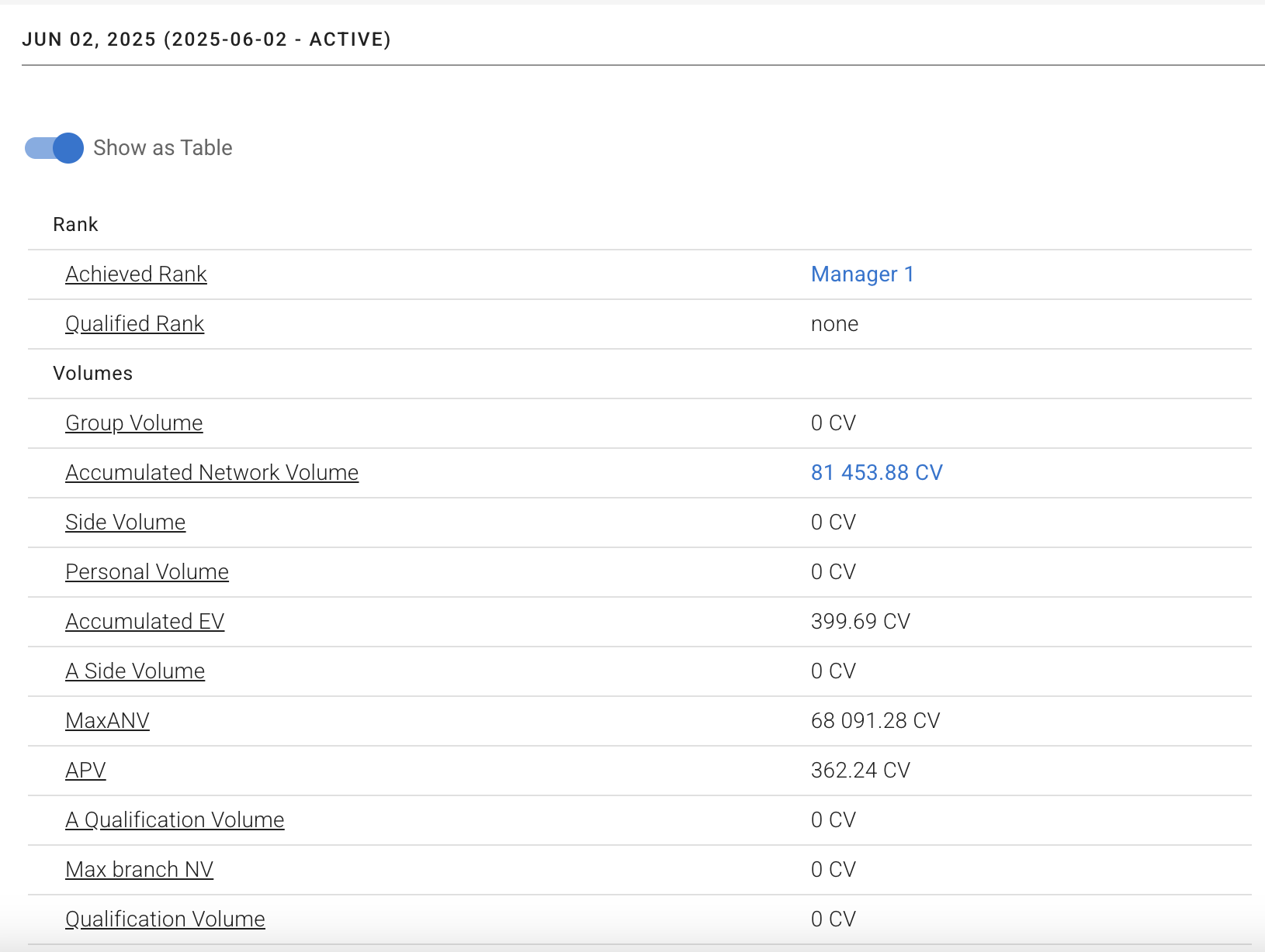 Depending on your compensation plan settings the values of some properties can be manually edited in the current period only, editable properties are highlighted in blue, click on a value to change it.