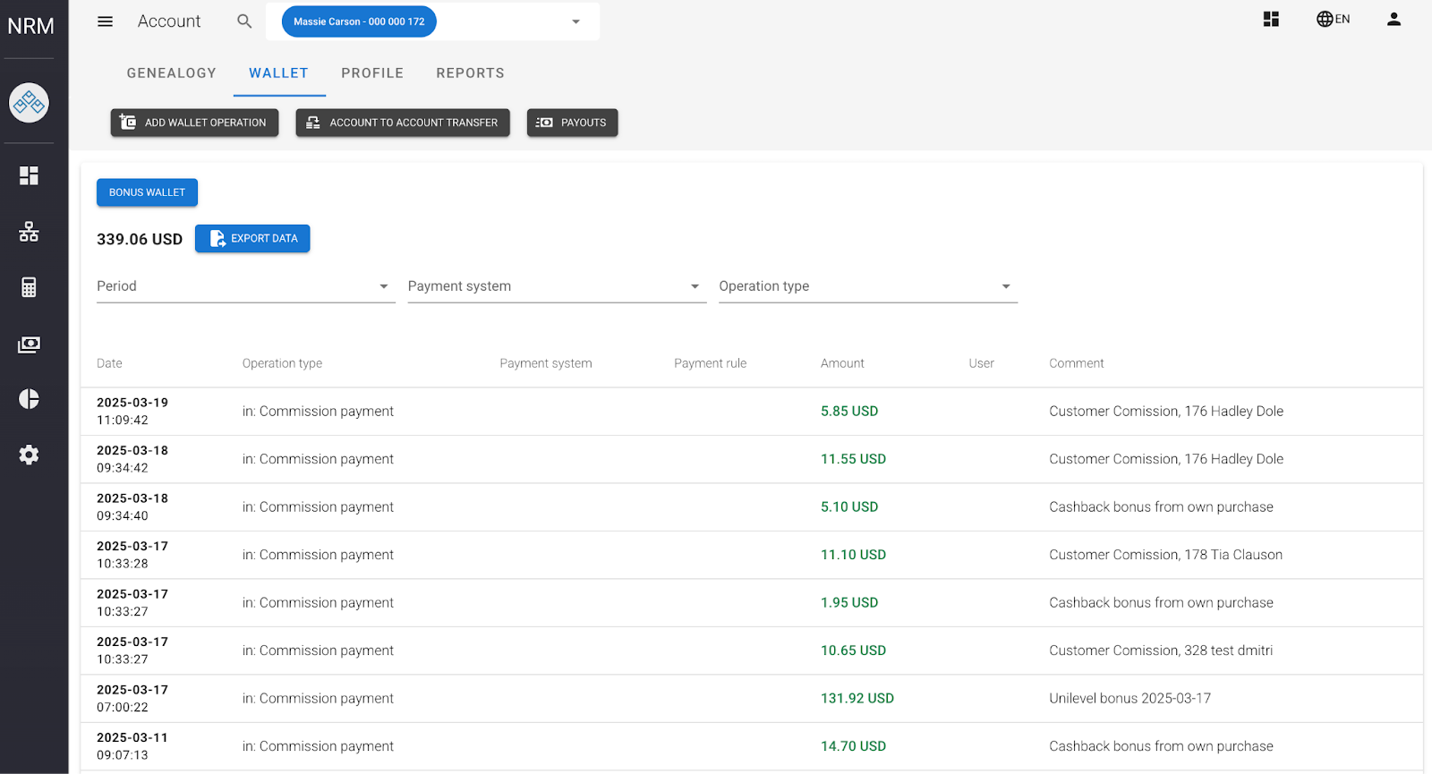 The Wallet tab on the account page displays the distributor’s financial transactions in chronological order (from the latest to the earliest).