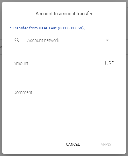 Account to account transfer button opens a window where you can transfer funds from the current wallet to another account’s wallet.