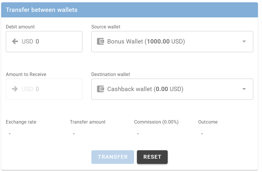 If the system provides for more than one wallet, the user can transfer funds between them. The exchange can take place in different currencies at a pre-set exchange rate or with a commission deduction.
