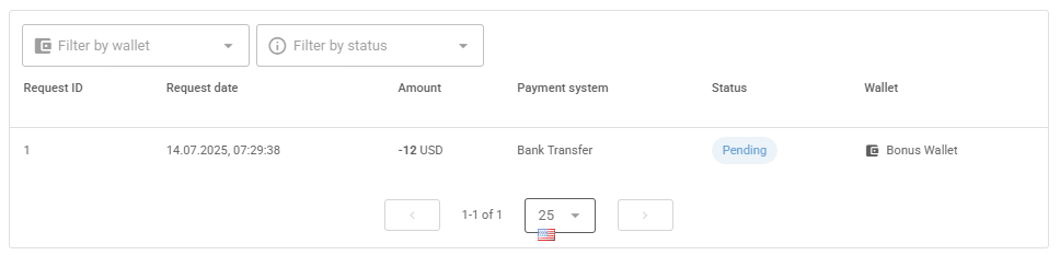 The component shows the list of payout requests created and its statuses. Requests can be filtered by status or wallet.